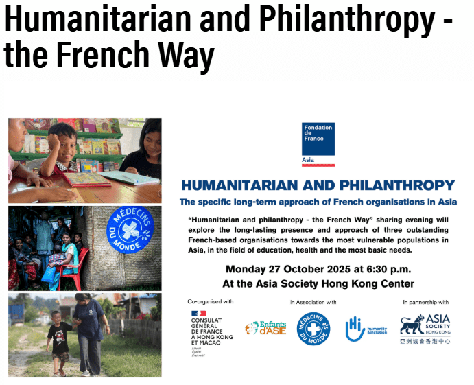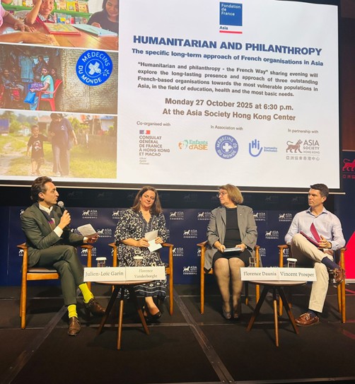 Du 27 au 29 octobre 2025, Enfants d’Asie a été invité par la Fondation de France – Asia à participer à une série de rencontres stratégiques à Hong Kong, dans le cadre de l’événement “Humanitarian & Philanthropy: the French Way” organisé à l’Asia Society, en partenariat avec la Fondation de France – Asia et le Consulat général de France à Hong Kong. Vincent Prosper, directeur pays pour le Laos et le Cambodge, y a représenté l’association afin de renforcer la visibilité d’Enfants d’Asie et d’explorer de nouvelles opportunités de collaboration dans la région.